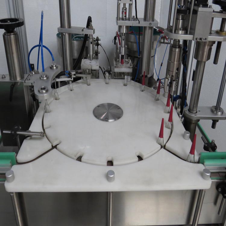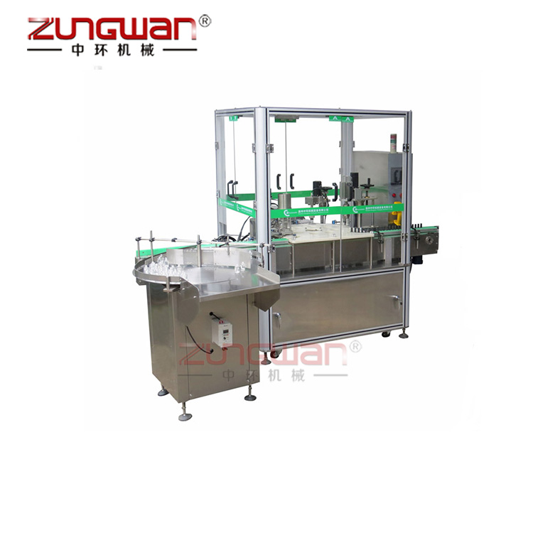 ZHY-50液體灌裝旋蓋機(jī),包括帶有灌裝接頭的灌裝機(jī)構(gòu)、旋蓋配置、灌裝流水線以及沿灌裝流水線運(yùn)動且用于固定瓶體的夾具,灌裝流水線上連接有用于控制夾具朝灌裝機(jī)構(gòu)方向運(yùn)動的升降機(jī)構(gòu),夾具包括用于固定瓶體的裝夾平臺以及與灌裝流水線位移配合的行走支架,裝夾平臺與行走支架轉(zhuǎn)動配合,裝夾平臺與灌裝機(jī)構(gòu)之間設(shè)置有用于使裝夾平臺繞行走支架頂端左右擺動的擺動機(jī)構(gòu)。當(dāng)固定有瓶體的夾具運(yùn)動至灌裝接頭下方時,利用升降機(jī)構(gòu)瓶體沿豎直方向運(yùn)動,使得瓶體上端瓶口與灌裝接頭相對接,在瓶體下降的過程中,利用擺動機(jī)構(gòu),使得裝夾平臺能夠繞行走支架頂端左右擺動,進(jìn)而搖晃瓶體內(nèi)部的液體,通過搖晃使瓶體中液體內(nèi)的氣泡溢出。