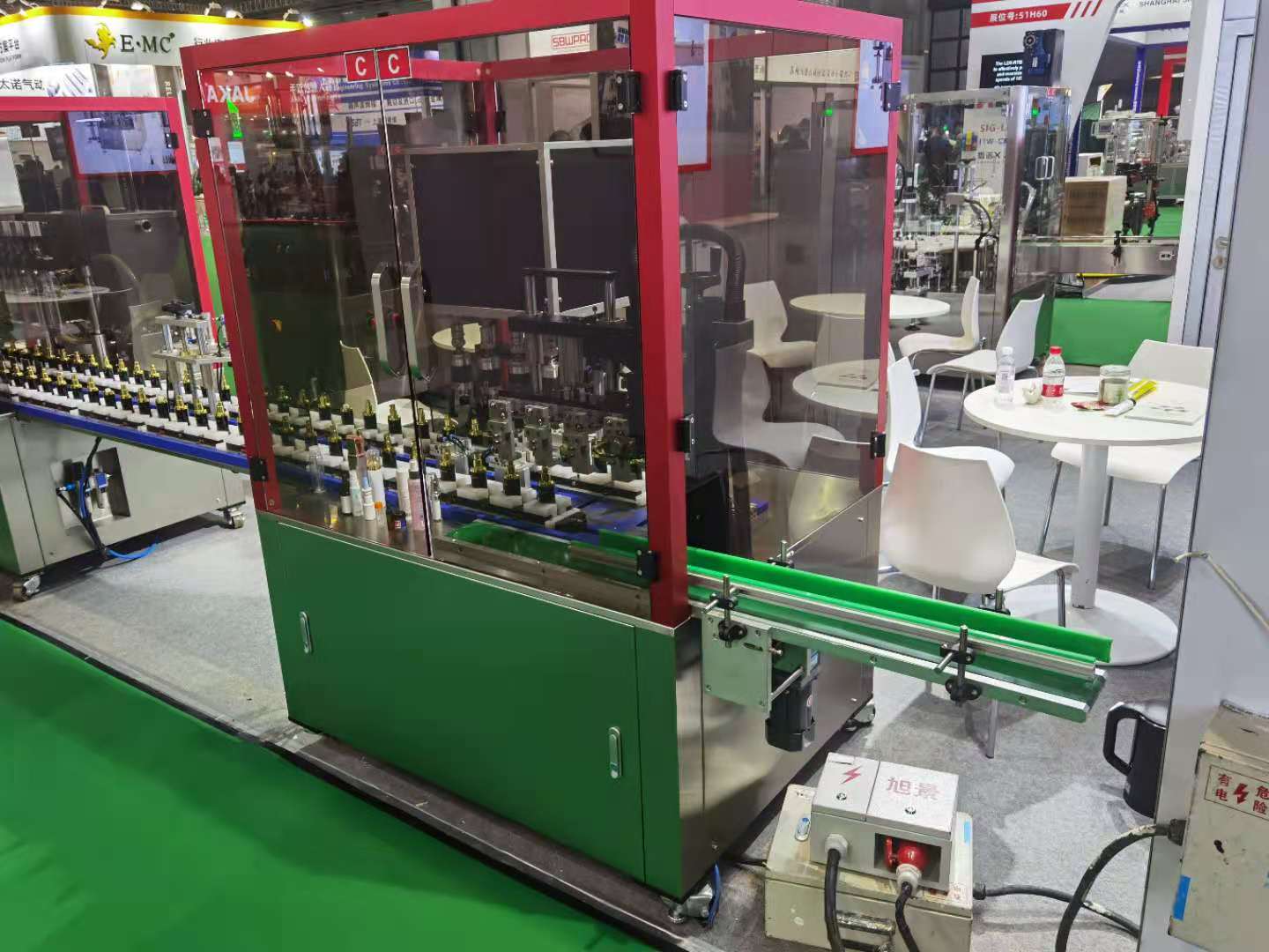 5、人工放瓶、瓶內清潔、定量灌裝、人工放蓋、自動擰緊、自動取瓶、貼標簽、可添加噴碼等.